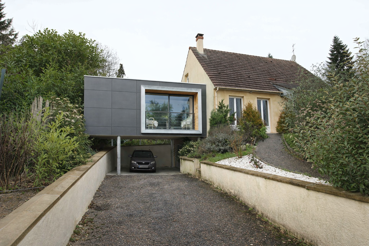 Extension contemporaine d’une maison existante, affirmant un contraste maîtrisé entre architecture ancienne et écriture actuelle.